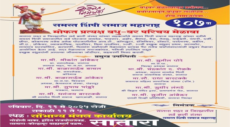 “वधुवर मेळाव्यातून प्रबोधन… प्रबोधनातून वधुवर संशोधन… हीच समाजसेवा…” या ध्येयवाक्याला साकारत समस्त शिंपी समाज महाराष्ट्र आणि सातारा शहर व जिल्ह्यातील सर्व ज्ञाती संस्थांच्या संयुक्त विद्यमाने १०७ वा मोफत प्रत्यक्ष वधुवर परिचय मेळावा रविवार, ११ मे २०२५ रोजी सकाळी ११ ते दुपारी ५ या वेळेत सौभाग्य मंगल कार्यालय, गोडोली नाका, सातारा येथे आयोजित करण्यात आला आहे.